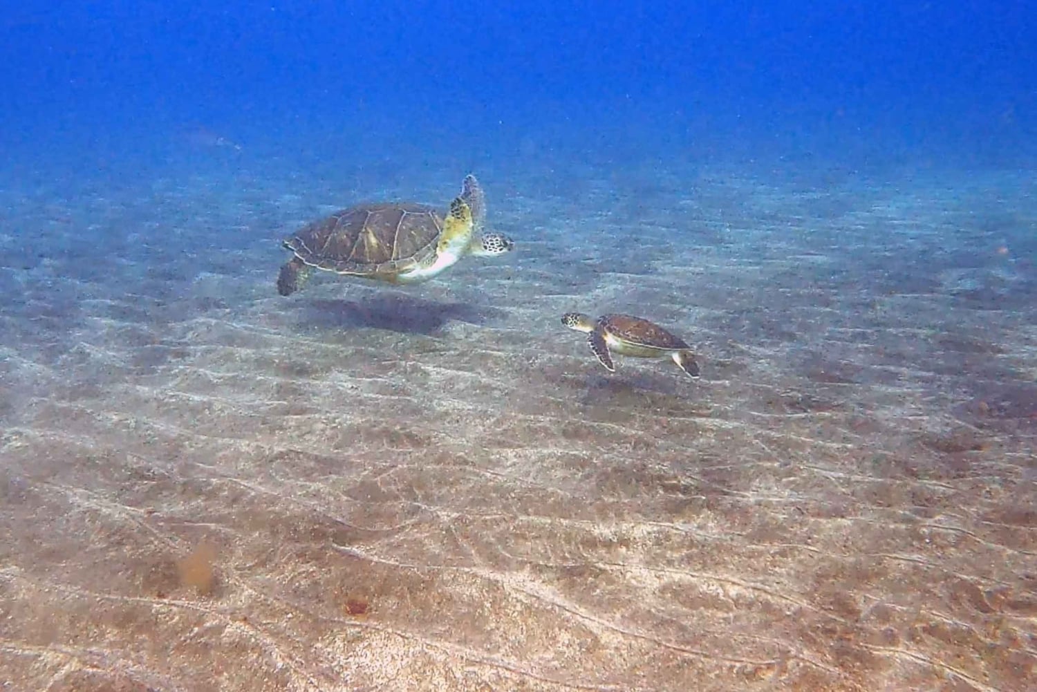 Vi tager til det område, hvor en familie af grønne skildpadder og forskellige typer rokker lever for at få mulighed for at lære dem nærmere at kende og svømme med dem.