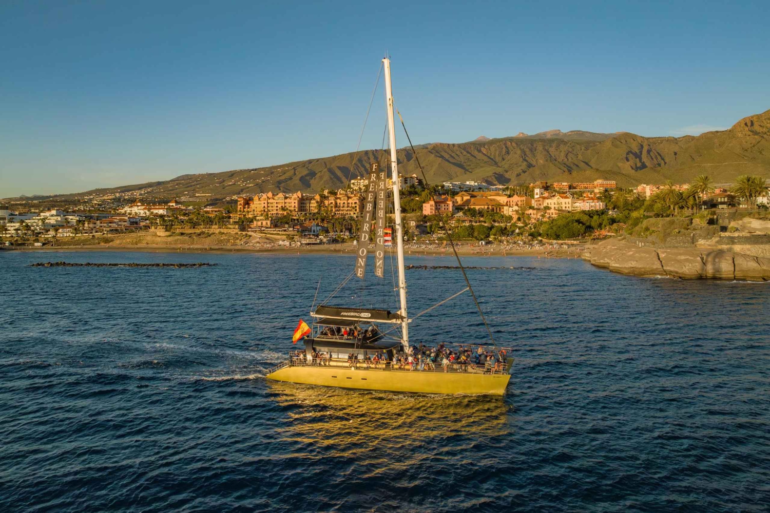 Nyd en udflugt med hval- og delfinsafari i Costa Adeje. De komfortable katamaraner er udstyret med alle bekvemmeligheder, så du kan nyde en afslappende dag og komme i kontakt med naturen. Sandwiches og drikkevarer er inkluderet.