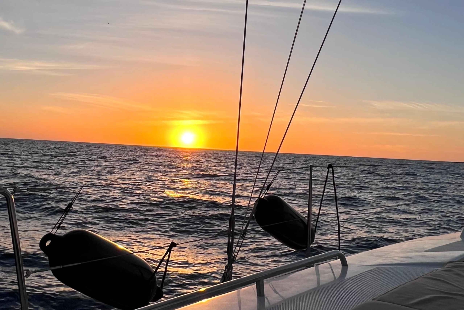 Senti la brezza marina e come il vento accarezza la tua pelle. Ascolta come le onde ci accompagnano durante la navigazione e osserva come il sole sta scomparendo, mentre assaggi i prodotti nazionali.