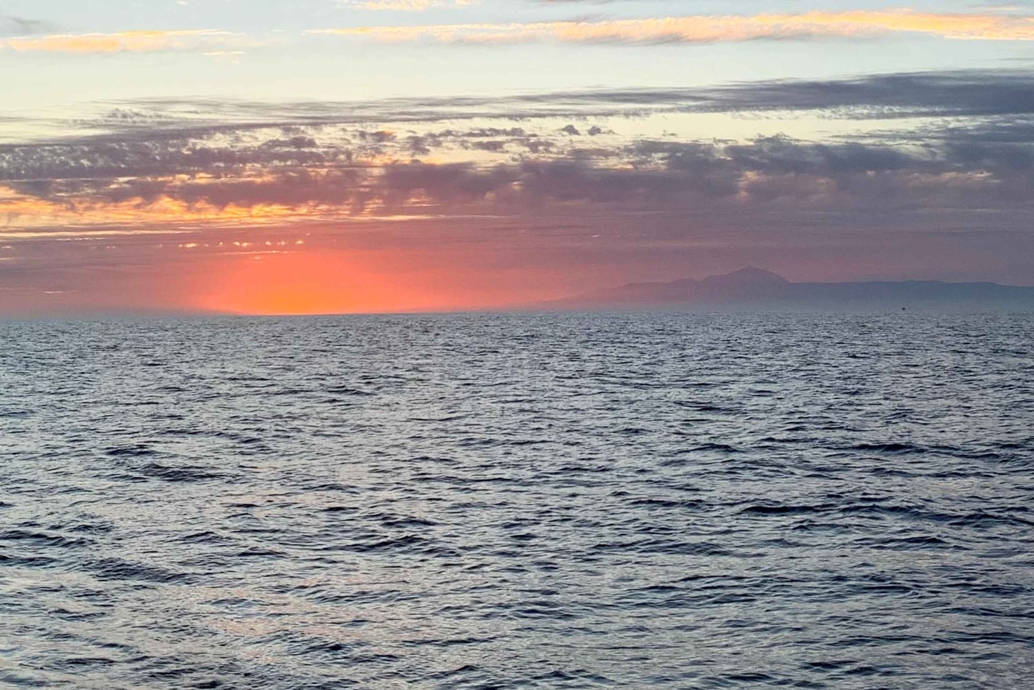 Ti daremo il benvenuto a bordo con un bicchiere di champagne. Facciamo rotta verso il Faro di Maspalomas. Dove vedremo in prima linea di costa i maestosi hotel che disegnano la linea della costa. Poi potremo ammirare il luogo naturale delle Dune di Maspalomas. Tutto questo può essere goduto sul ponte allestito con un ampio solarium con materassi o dal comodo pozzetto della barca a vela. Cambieremo rotta verso il tramonto e continueremo a navigare e nel frattempo potrai gustare un piccolo aperitivo con prodotti nazionali. Dobbiamo prestare particolare attenzione... poco prima che il sole scompaia, se le condizioni meteo lo permettono, forse riusciremo a vedere il raggio verde. Hai intenzione di perdertelo?