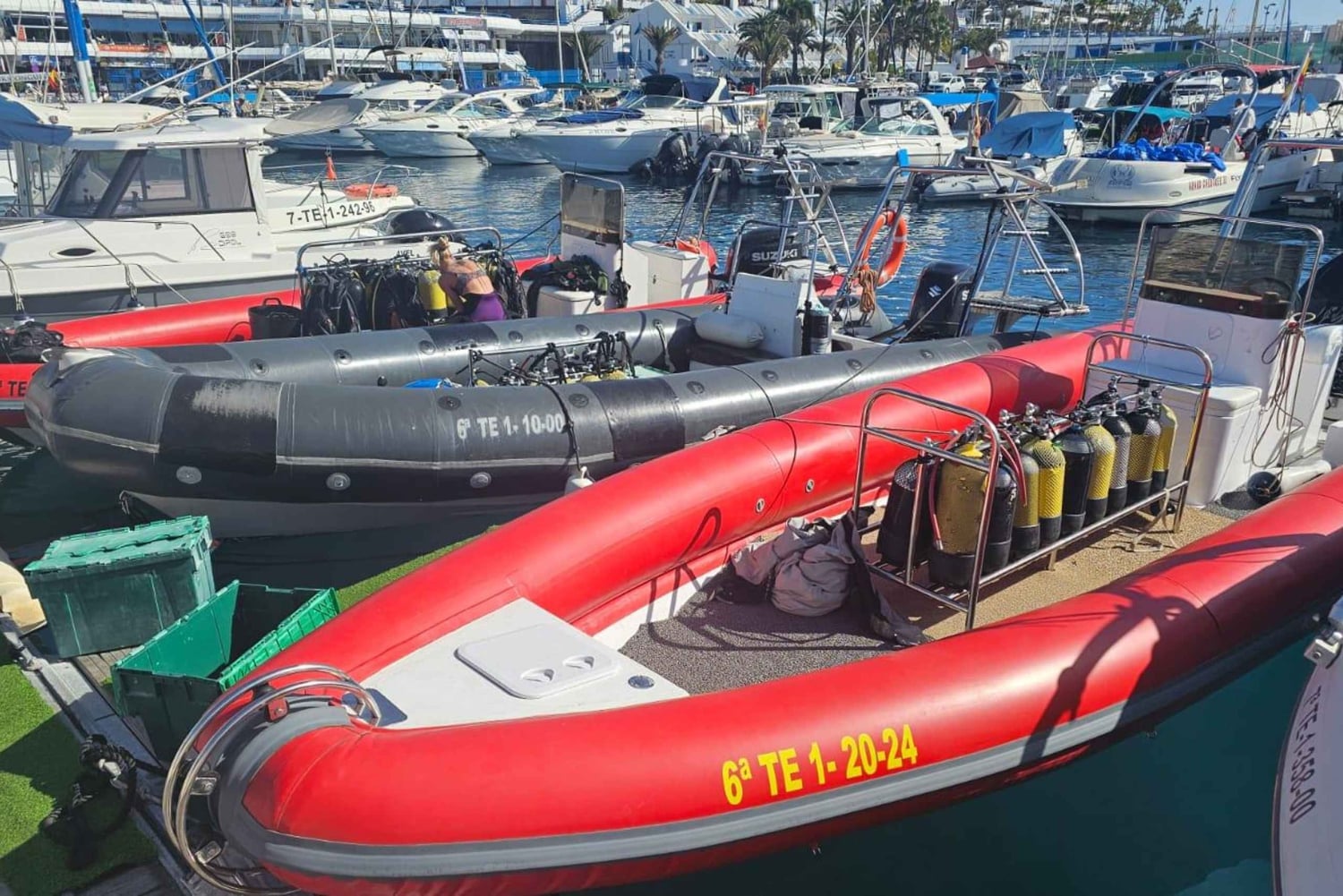 Begin je duikavontuur in Puerto Colon, het hart van Las Americas en Costa Adeje, op slechts 100 meter van de oceaan en onze boten. Stap aan boord van een van onze speedboten, die zijn uitgerust met alle benodigde duikuitrusting, en geniet van een zorgeloos avontuur. We verdelen beginners en gecertificeerde duikers in verschillende groepen.