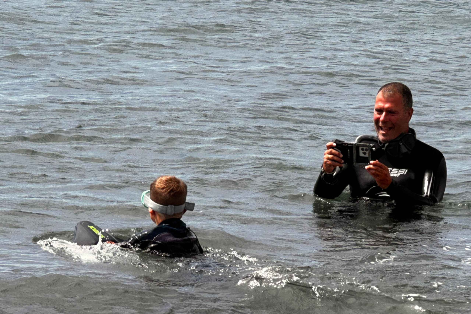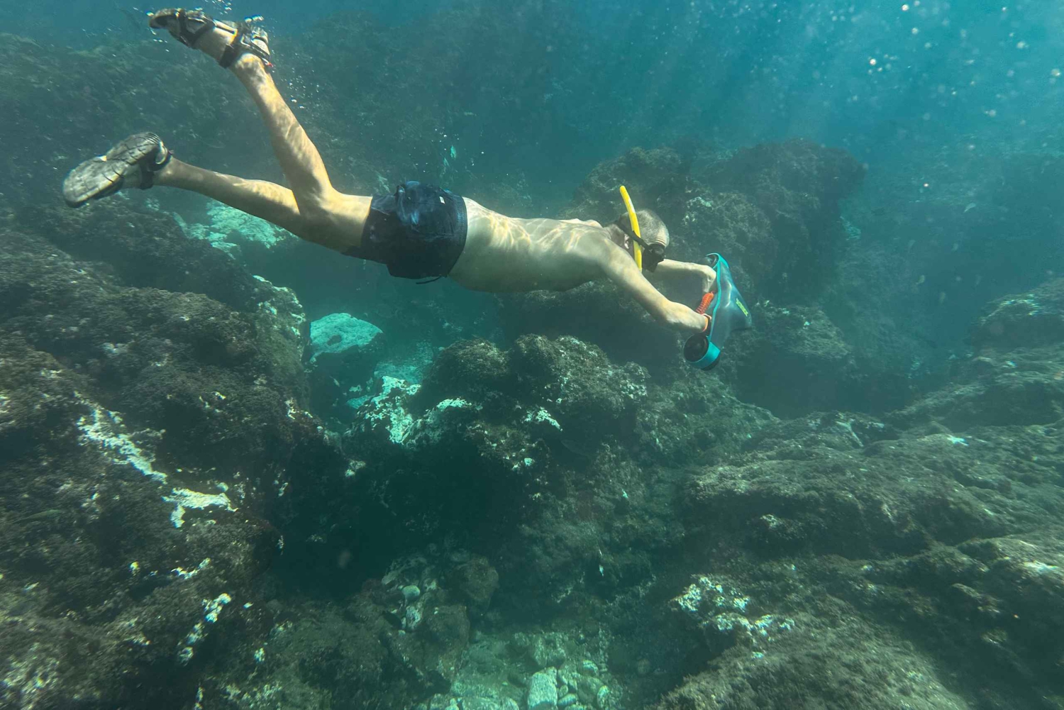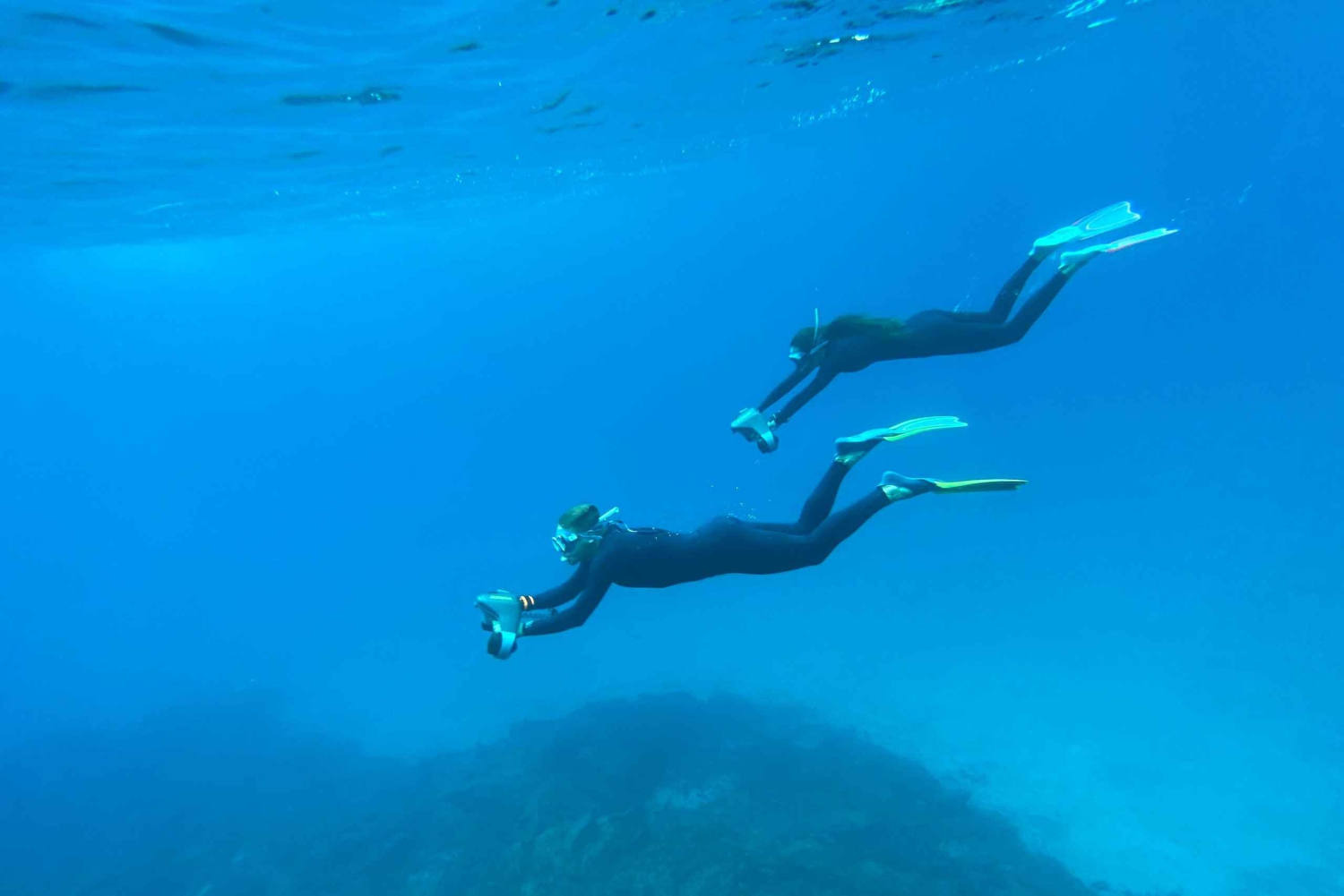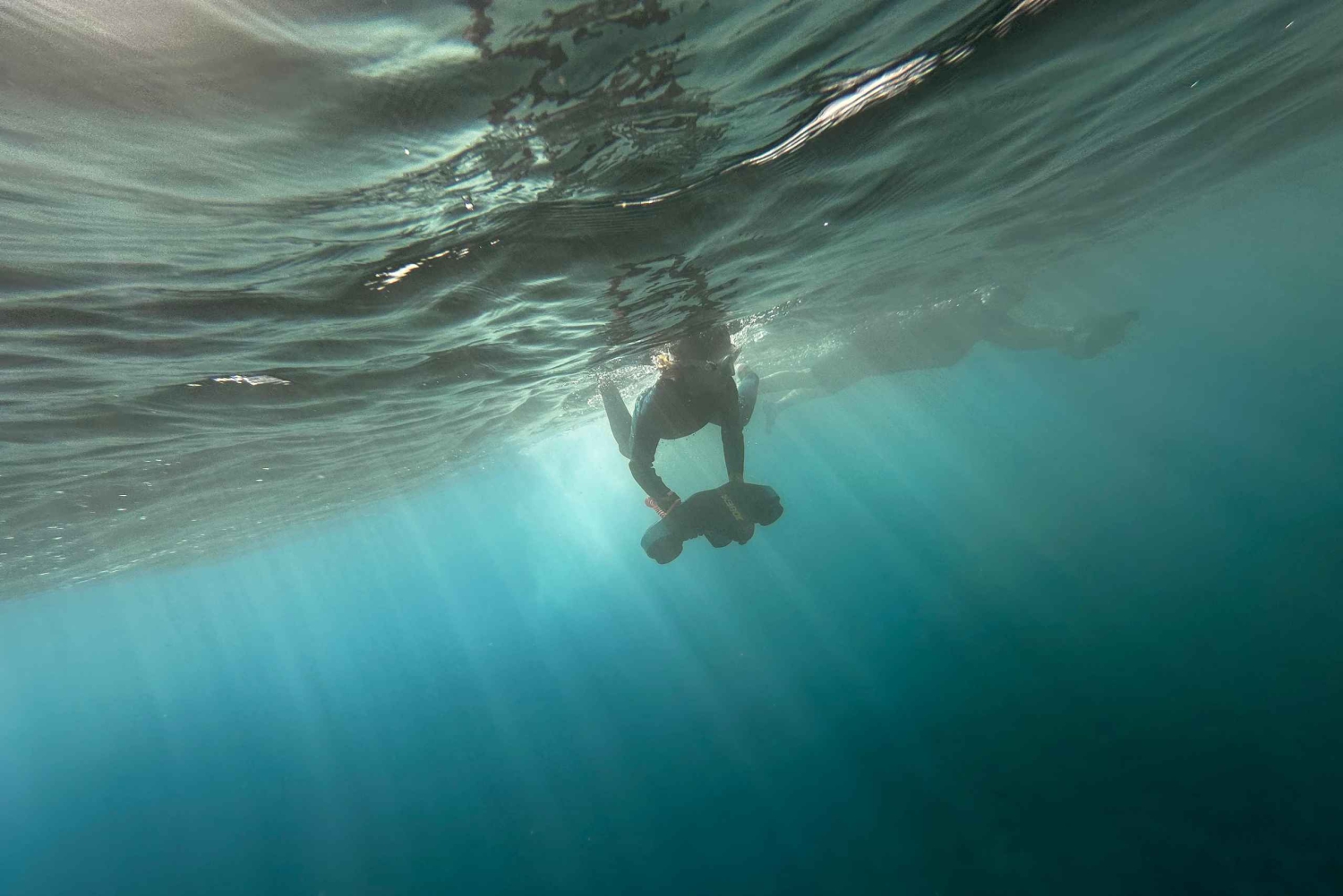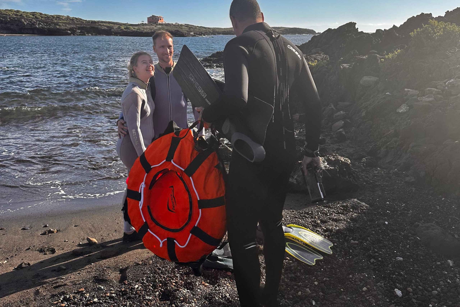 Na een klein gesprekje waarin je alle informatie krijgt over onze tour, trek je een wetsuit, masker, tube en vinnen aan en gaan we over het strand het water in.