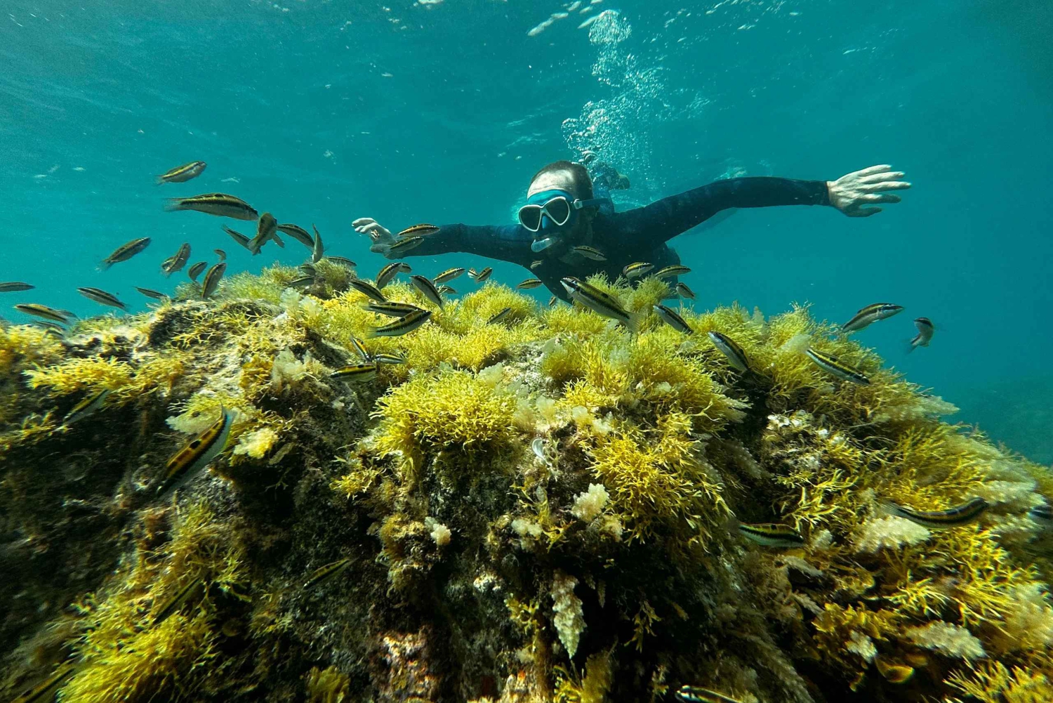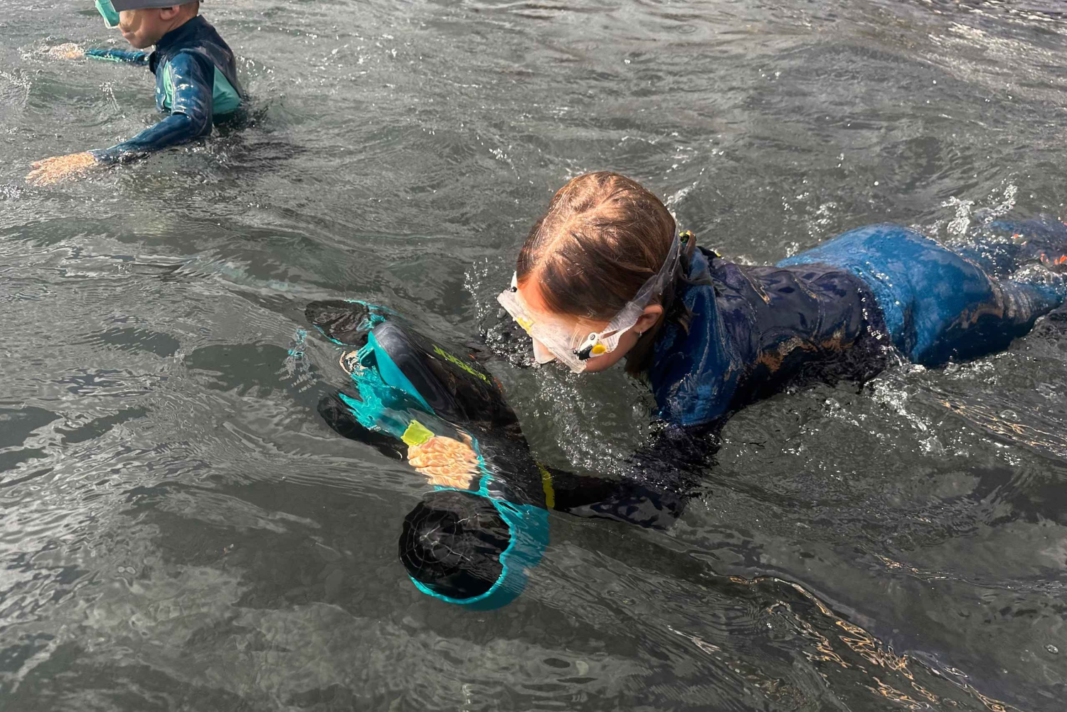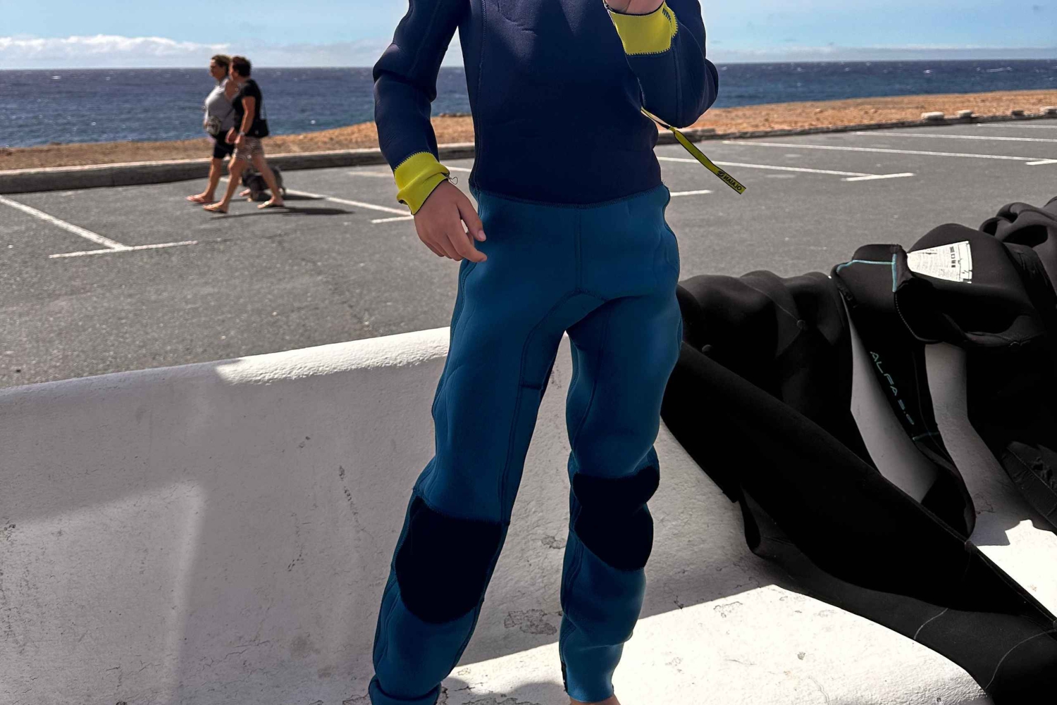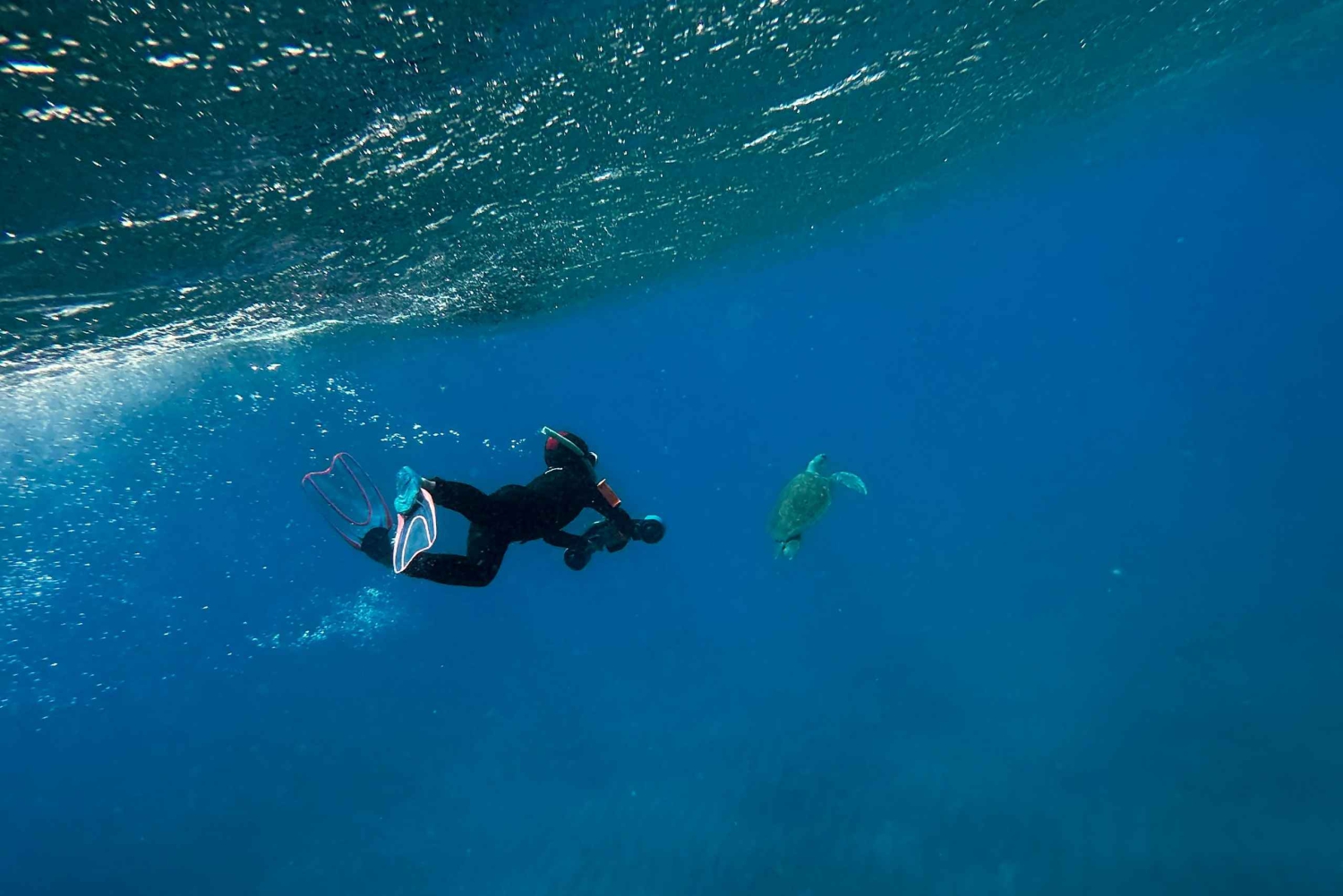 Na een klein gesprekje waarin je alle informatie krijgt over onze tour, trek je een wetsuit, masker, tube en vinnen aan en gaan we over het strand het water in.