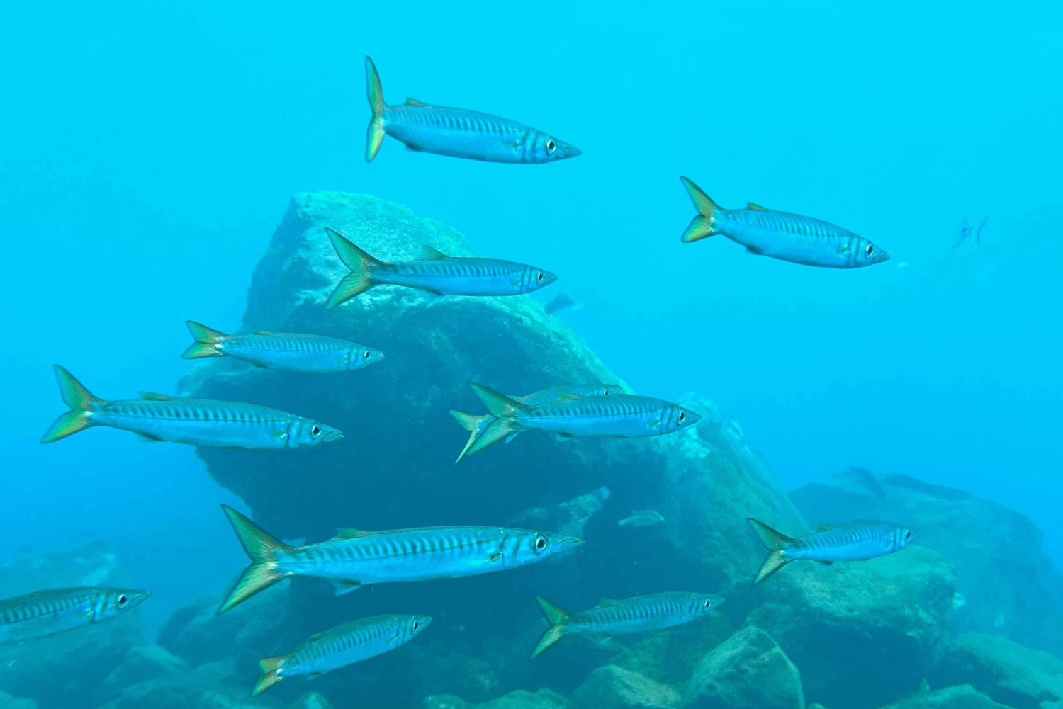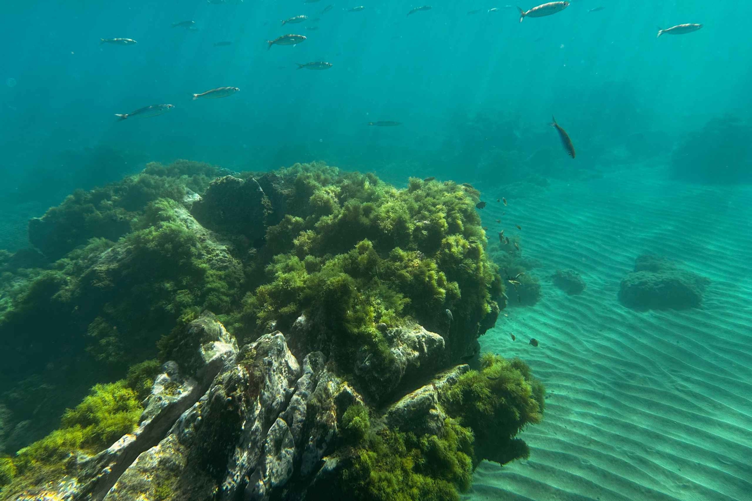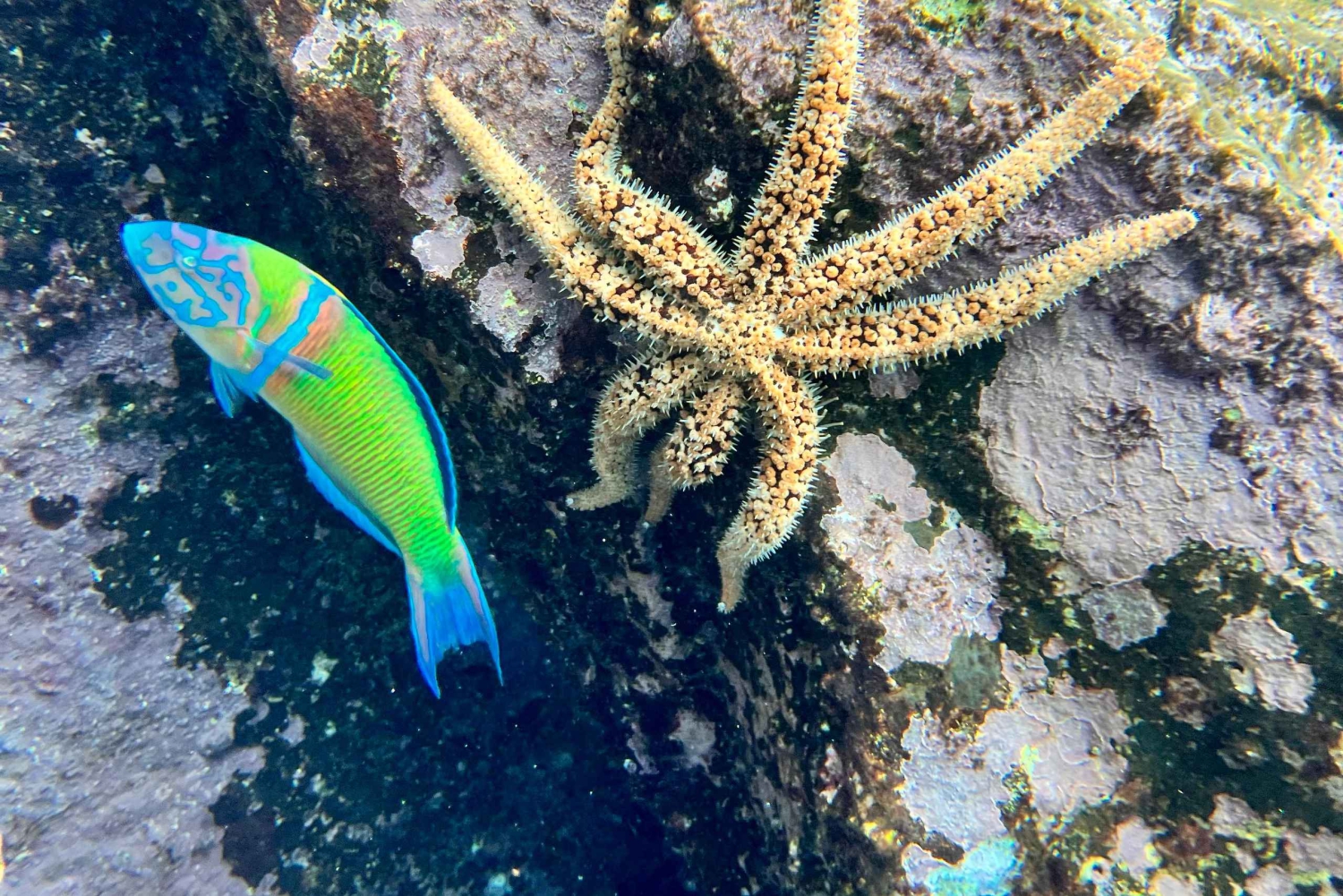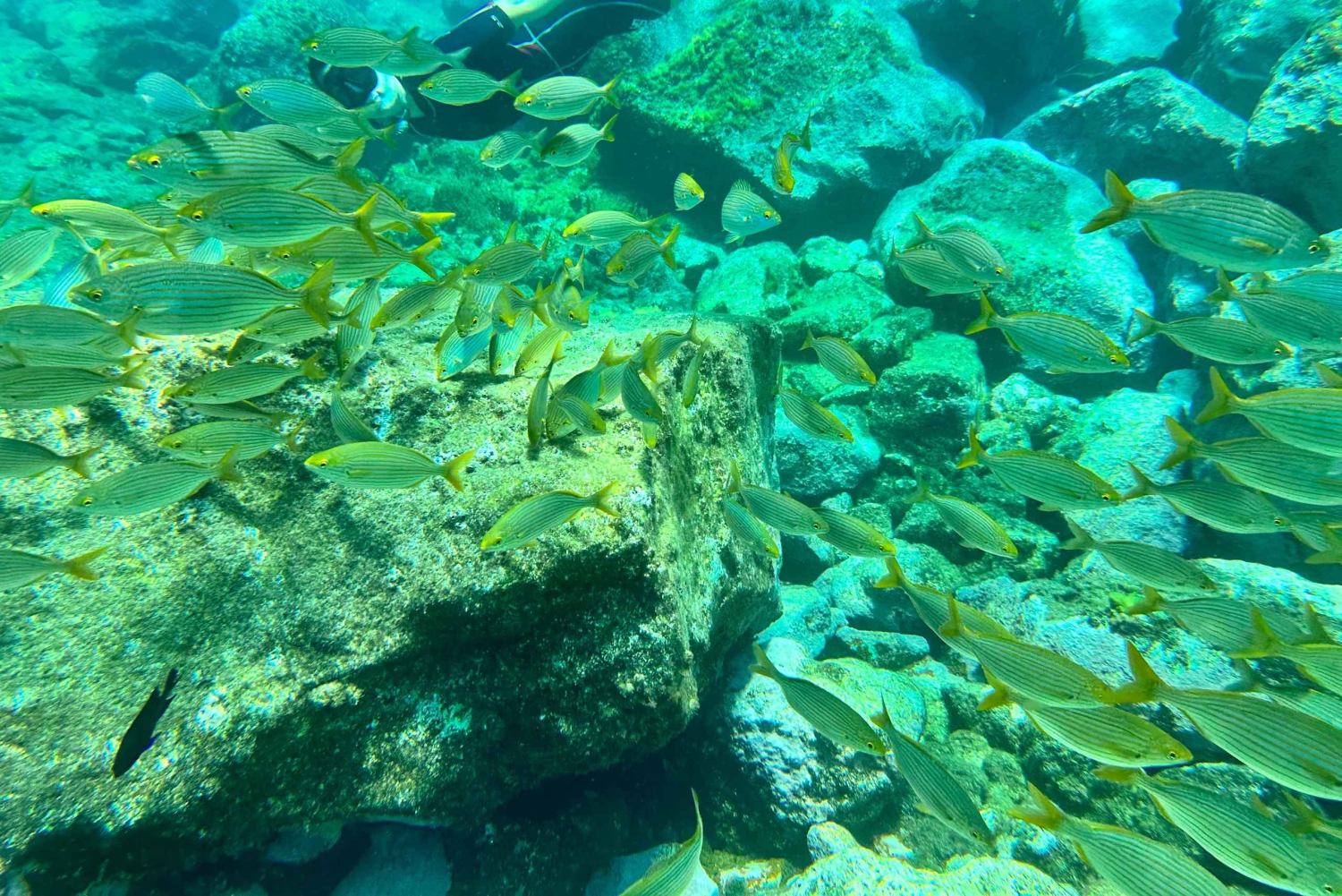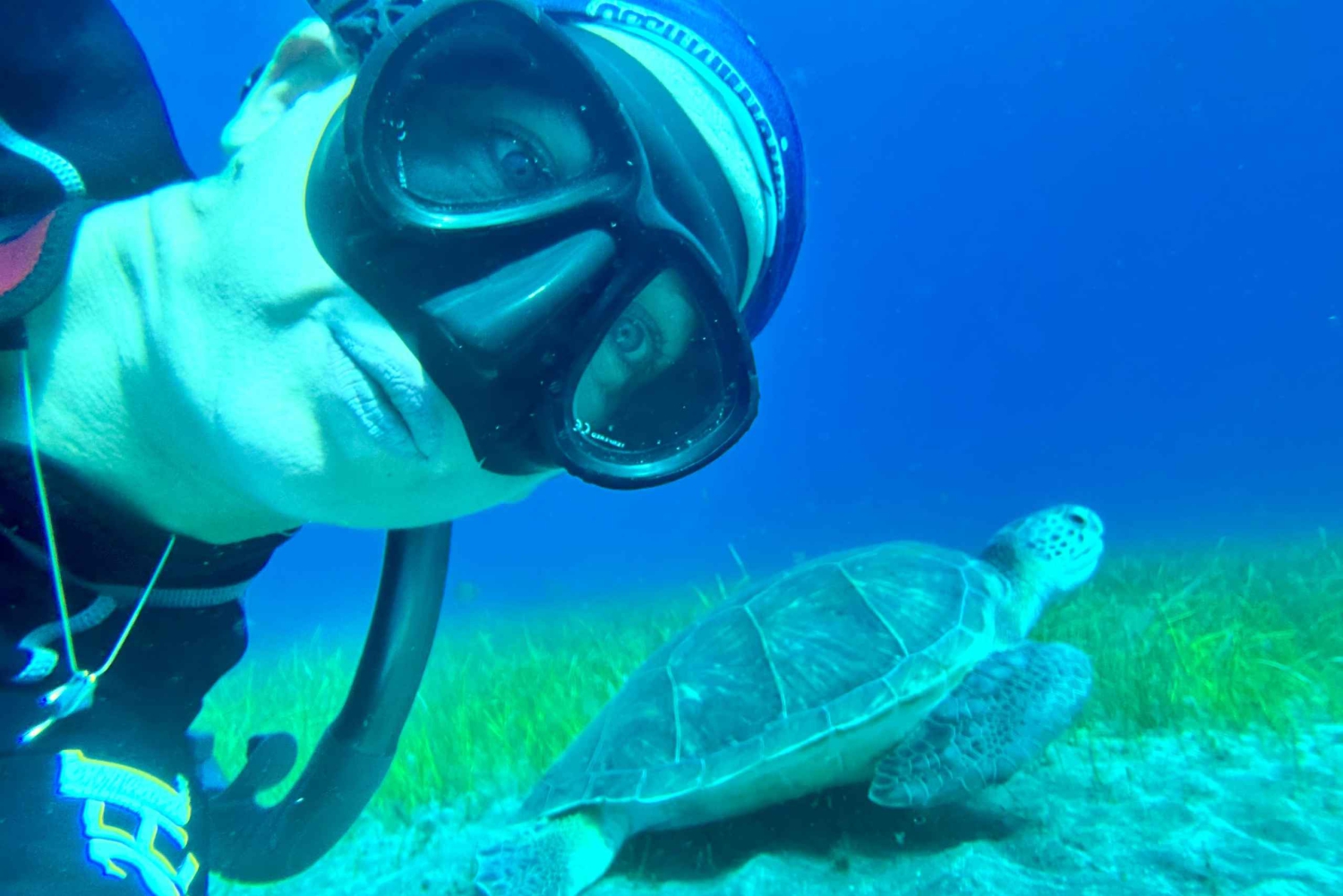 Na een klein gesprekje waarin je alle informatie krijgt over onze tour, trek je een wetsuit, masker, tube en vinnen aan en gaan we over het strand het water in.