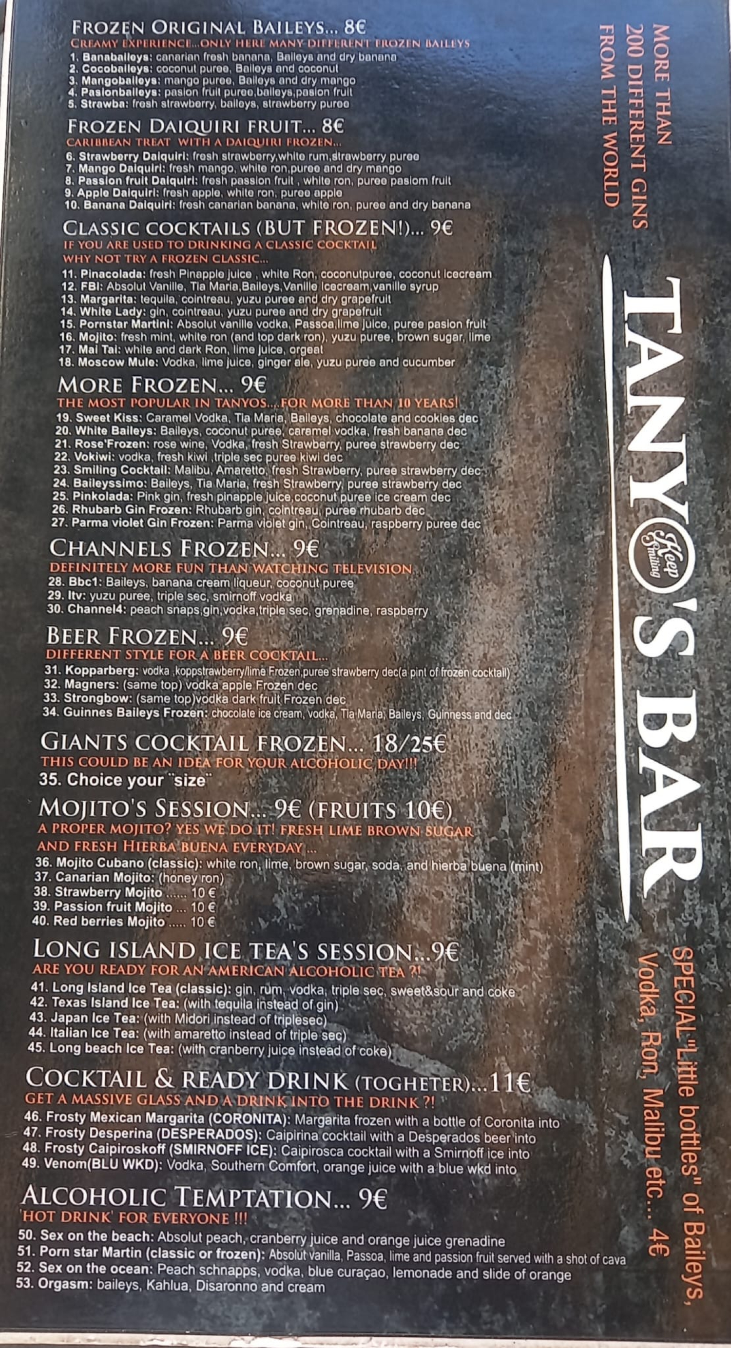 Tanyo's Bar in Costa Adeje is de plek waar eilandvibes samenkomen met serieuze cocktailvakmanschap. Zodra je op het zonovergoten terras stapt, word je verwelkomd met een ontspannen sfeer die je uitnodigt om te blijven hangen.