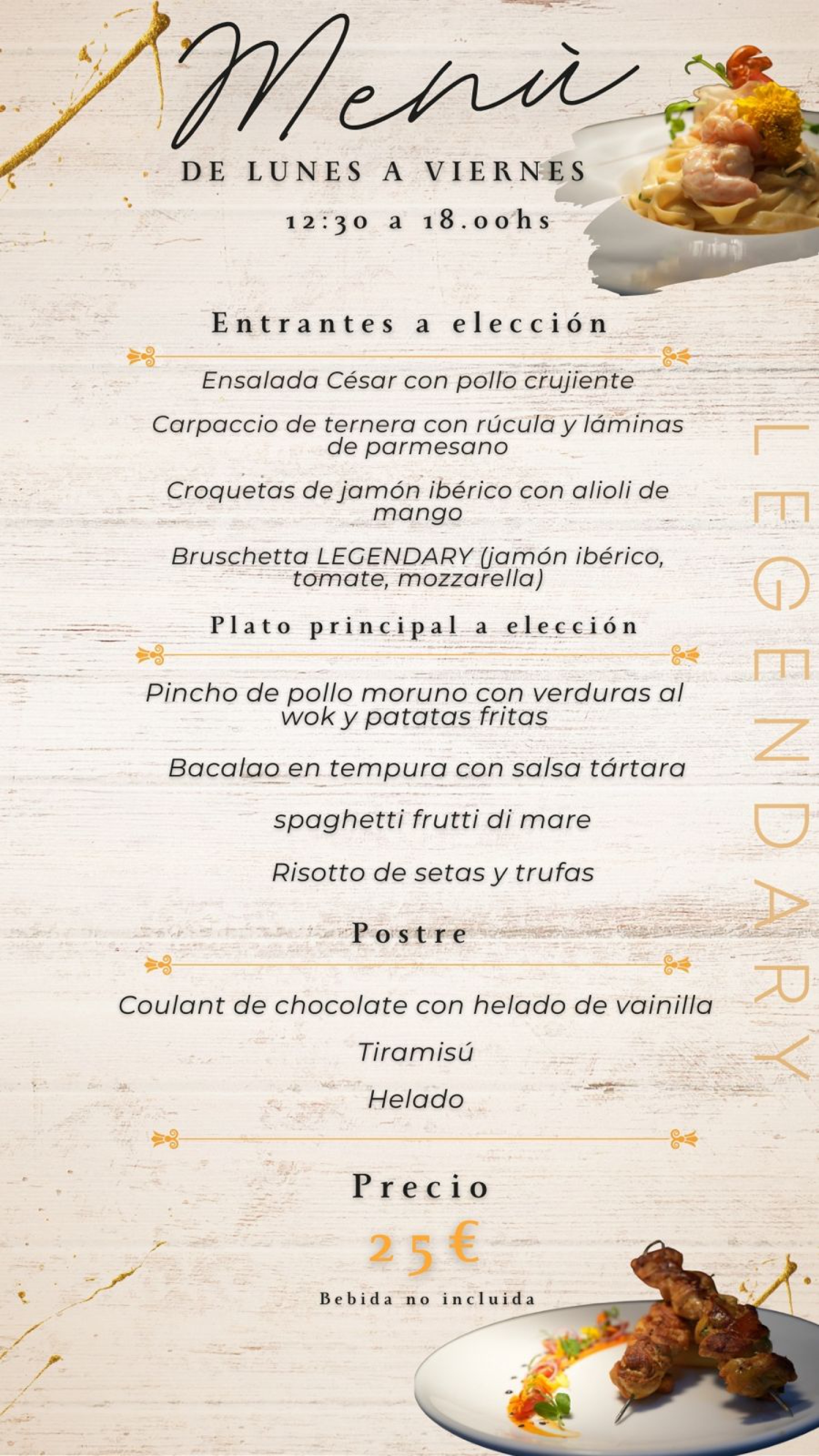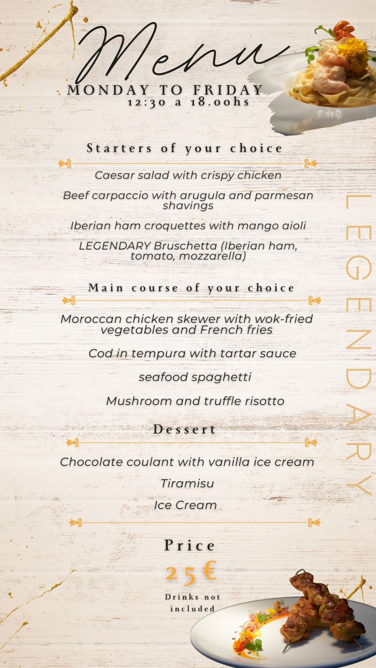 Select from 4 starters such as Caesar salad with crispy chicken, or Beef Carpaccio, then choose a main course such as Moroccan chicken skewers with vegetables and fries, or Cod in tempura with tartar sauce or their fresh seafood spaghetti or mushroom and truffle risotto.