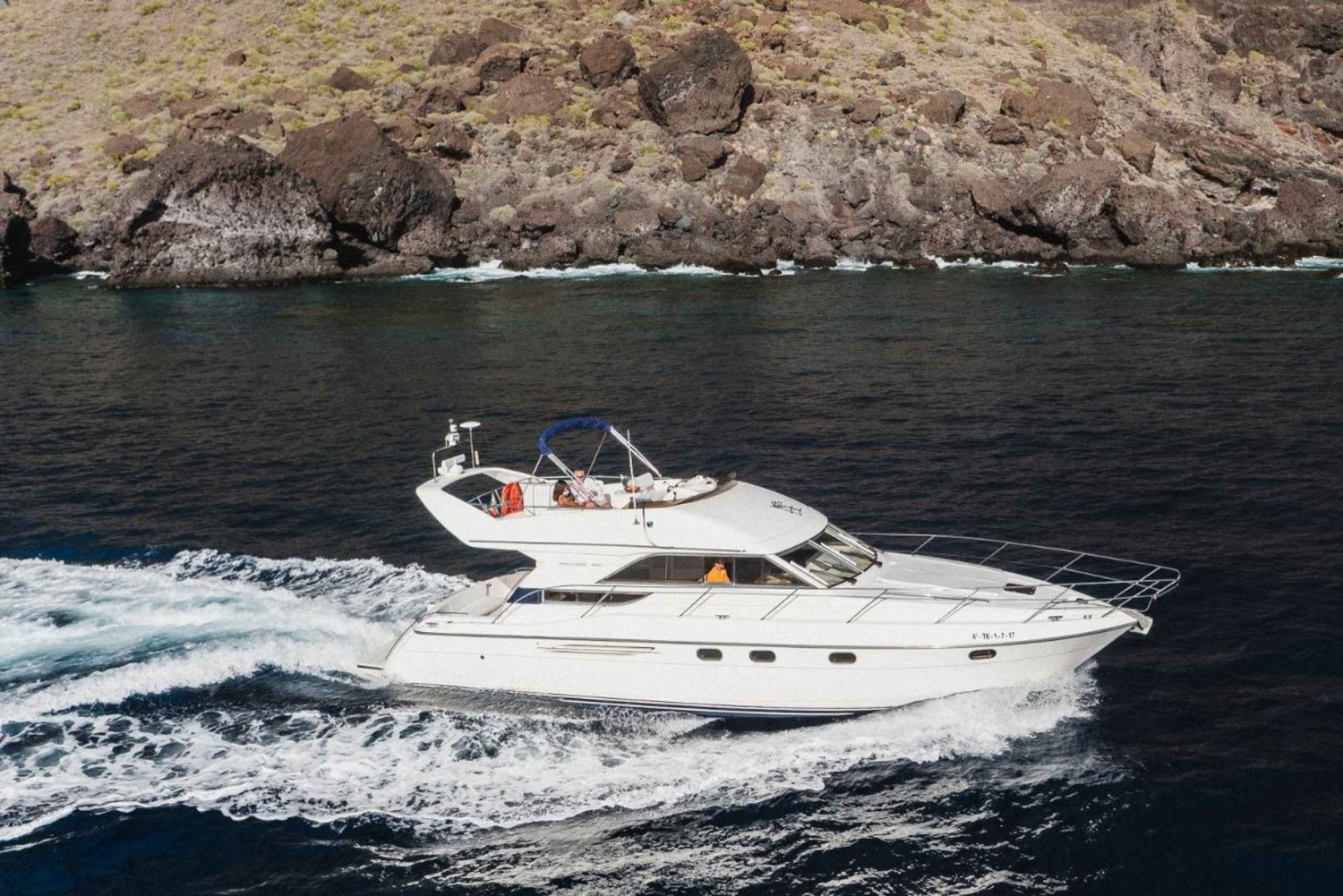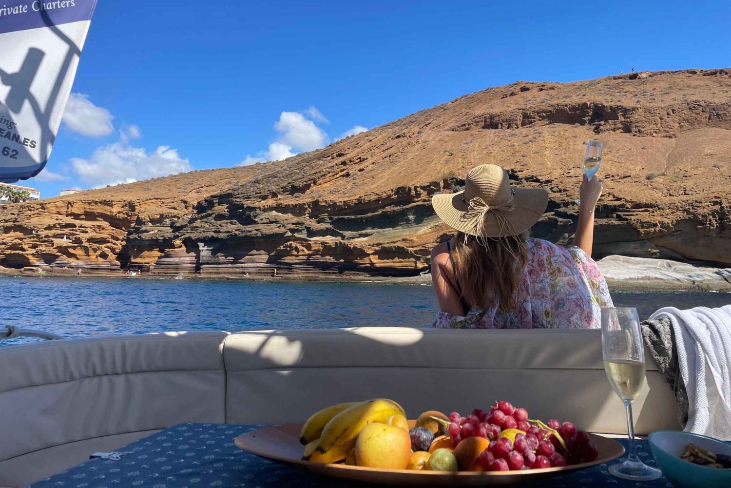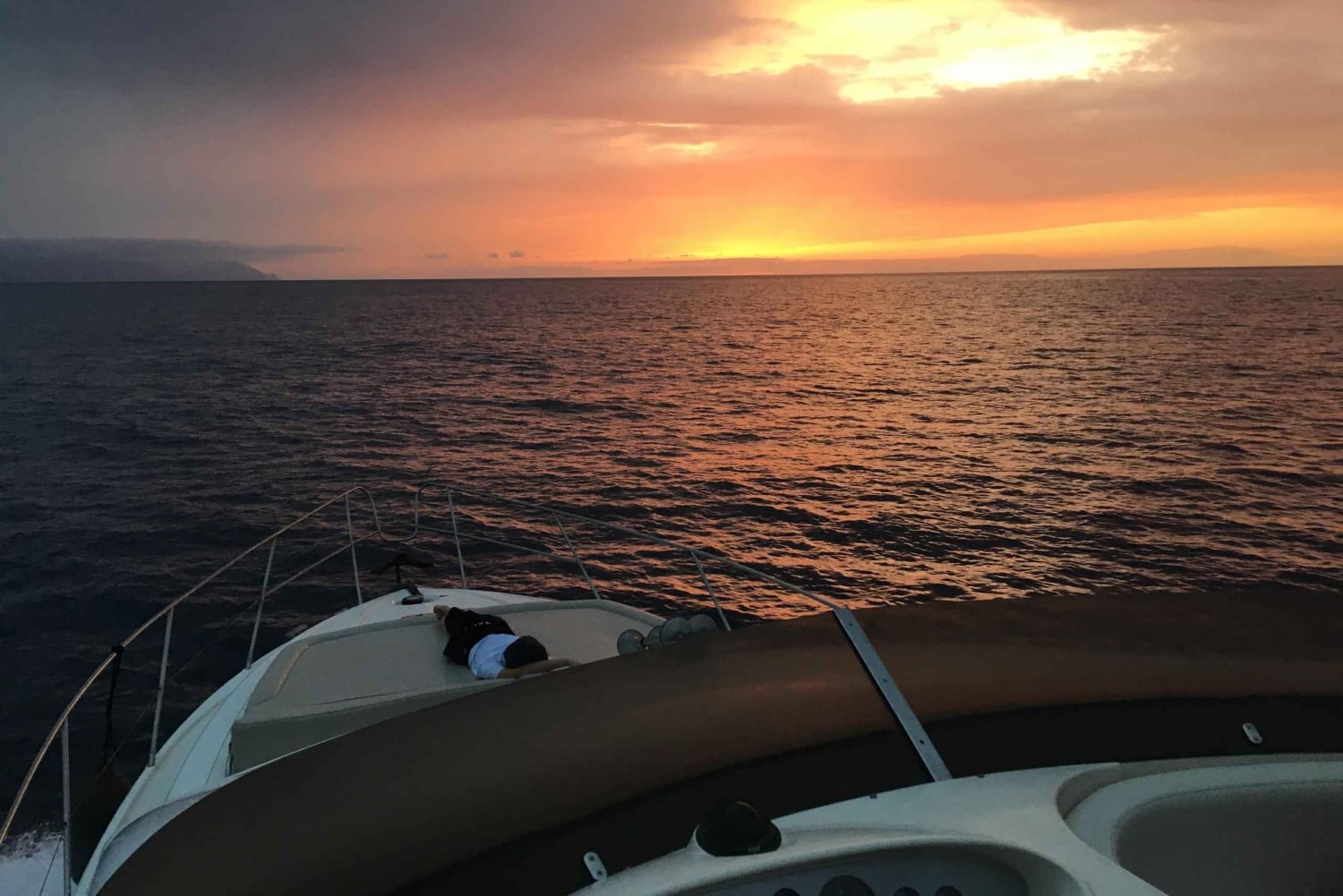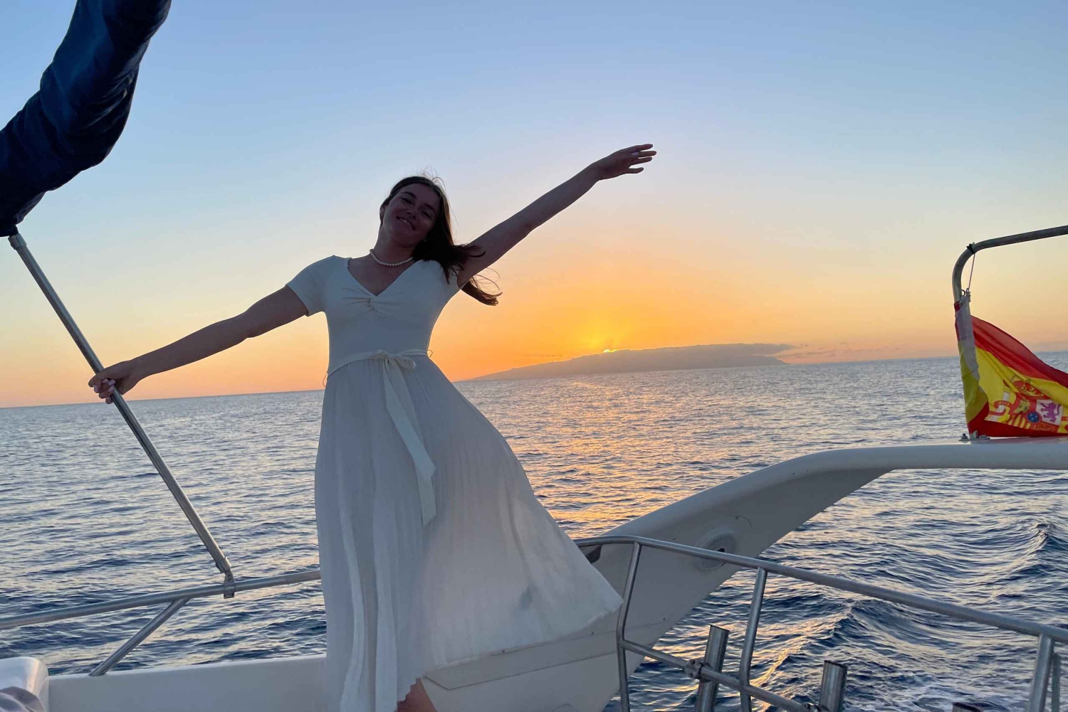 Откройте для себя закат в океане на прекрасной яхте. Попробуйте вкусную еду и неограниченное игристое вино, любуясь величественными видами и китами Тенерифе.
